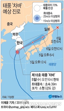 태풍 차바는 5일 오전 6시 현재 중심기압 960헥토파스칼(hPa)의 강한 소형 태풍으로 제주 동북동쪽 60㎞ 해상에서 시속 40㎞ 속도로 북동진하고 있습니다.